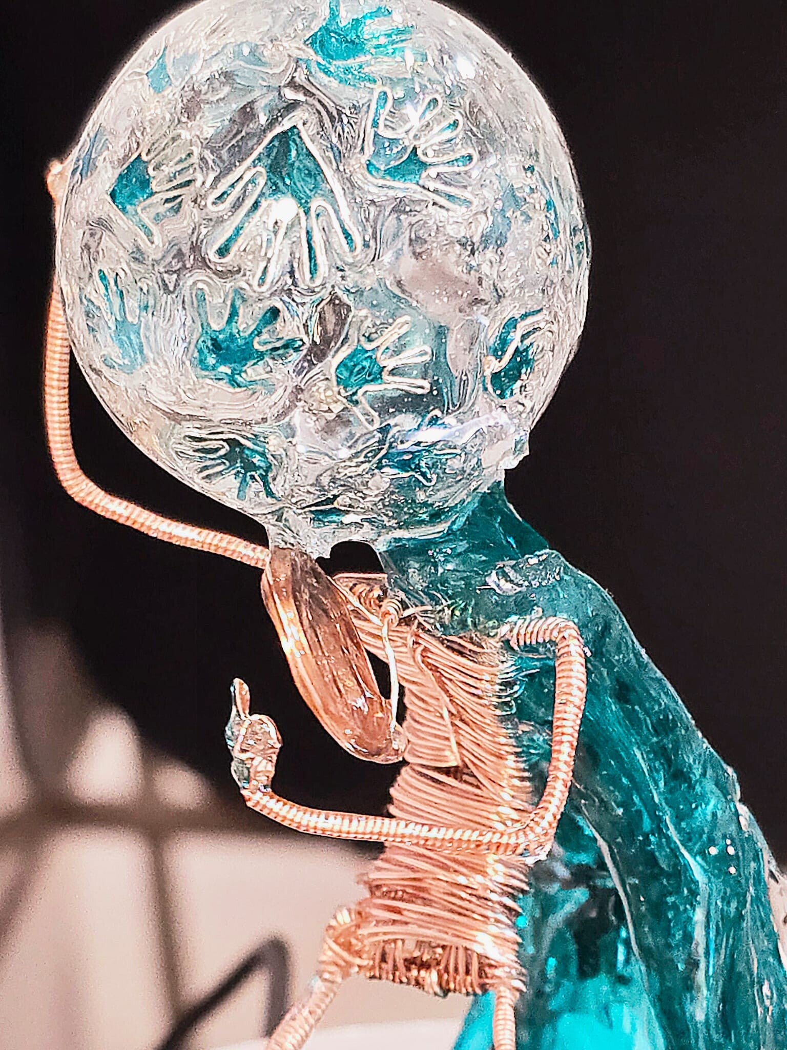 Statuina in resina di 13cm, con supporto e campana di vetro di circa 20cm x 21cm di diametro