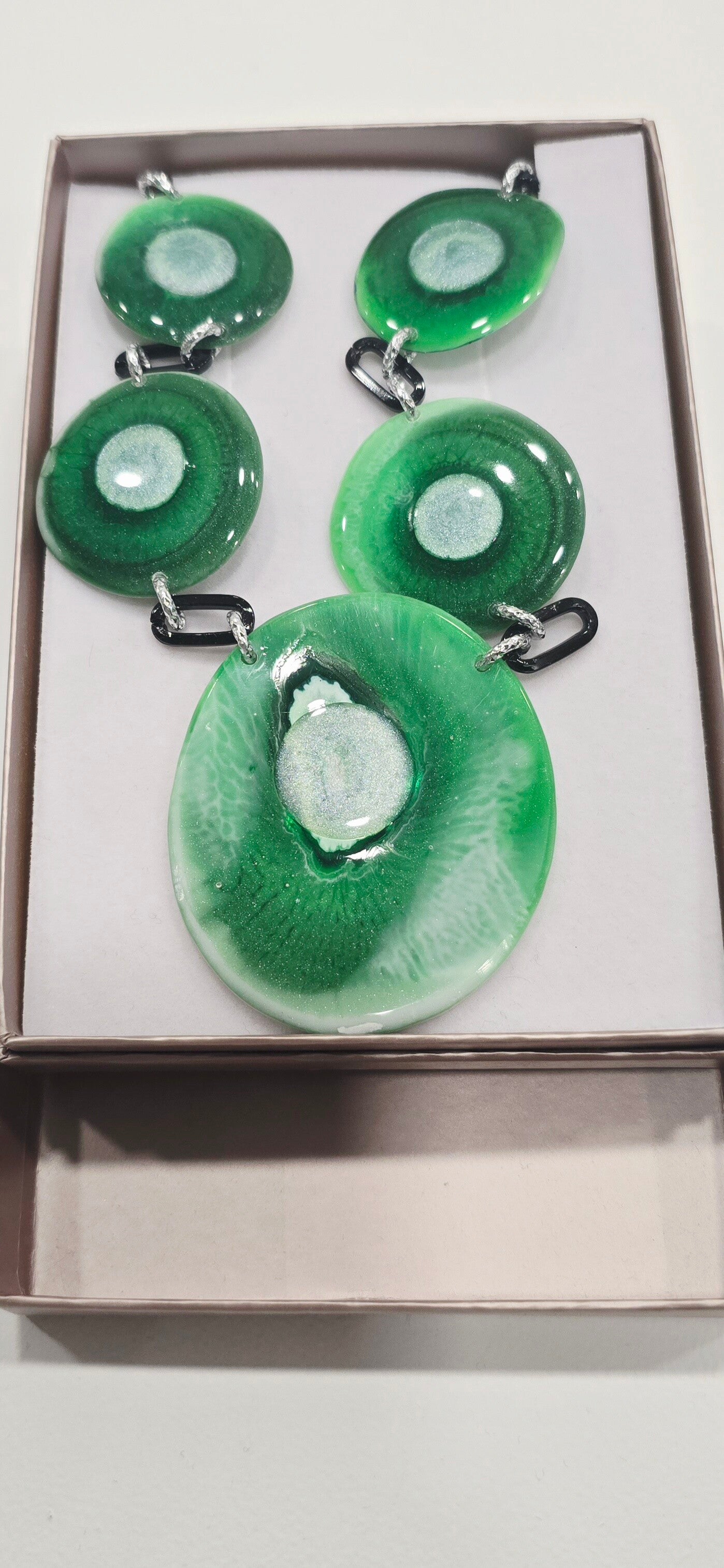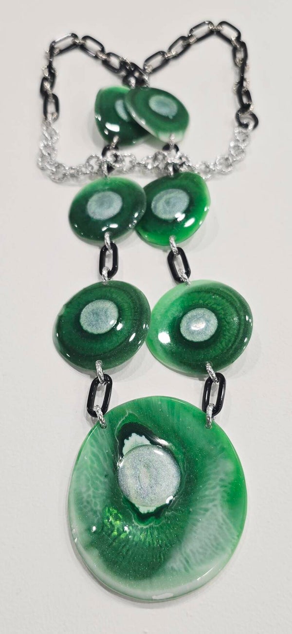 Collana con 7 elementi in resina varie tonalità di verde foresta, verde chiaro, nero, bianco. Elementi in acrilico nero e alluminio.