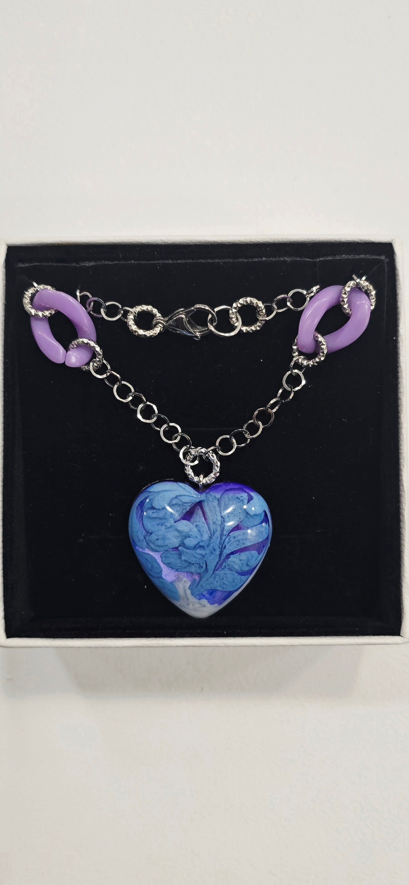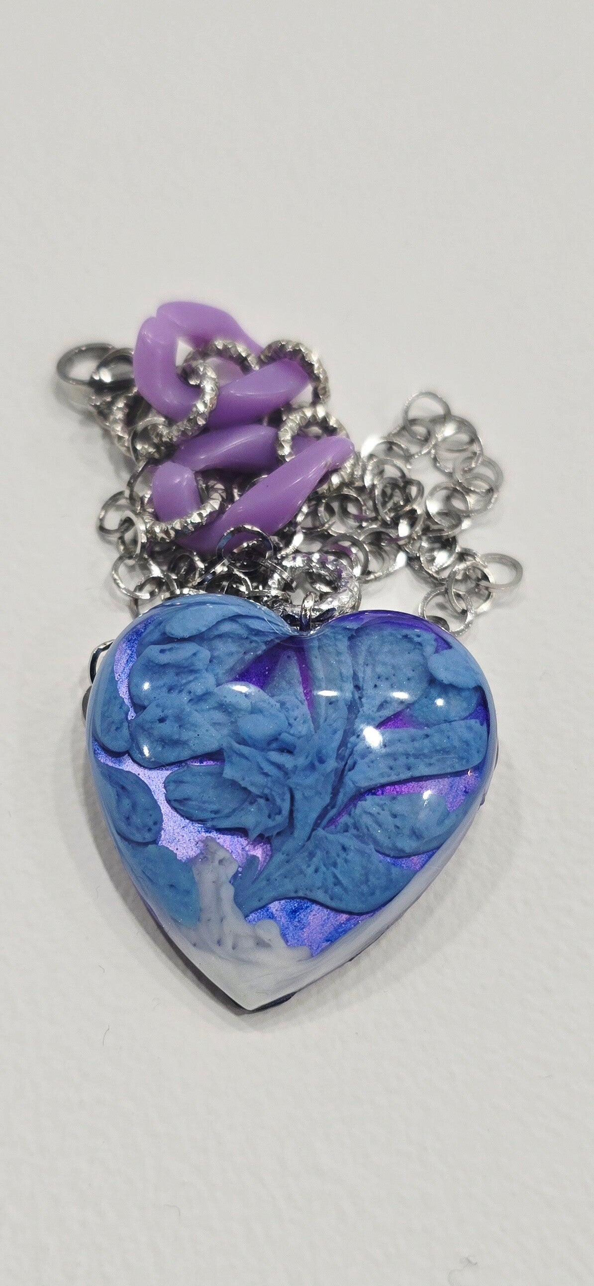Collana in resina lilla, viola, blu, bianco con effetti di colore 3D. Catena e chiusure in acciaio. Elementi in acrilico lilla e alluminio. Gioielleria