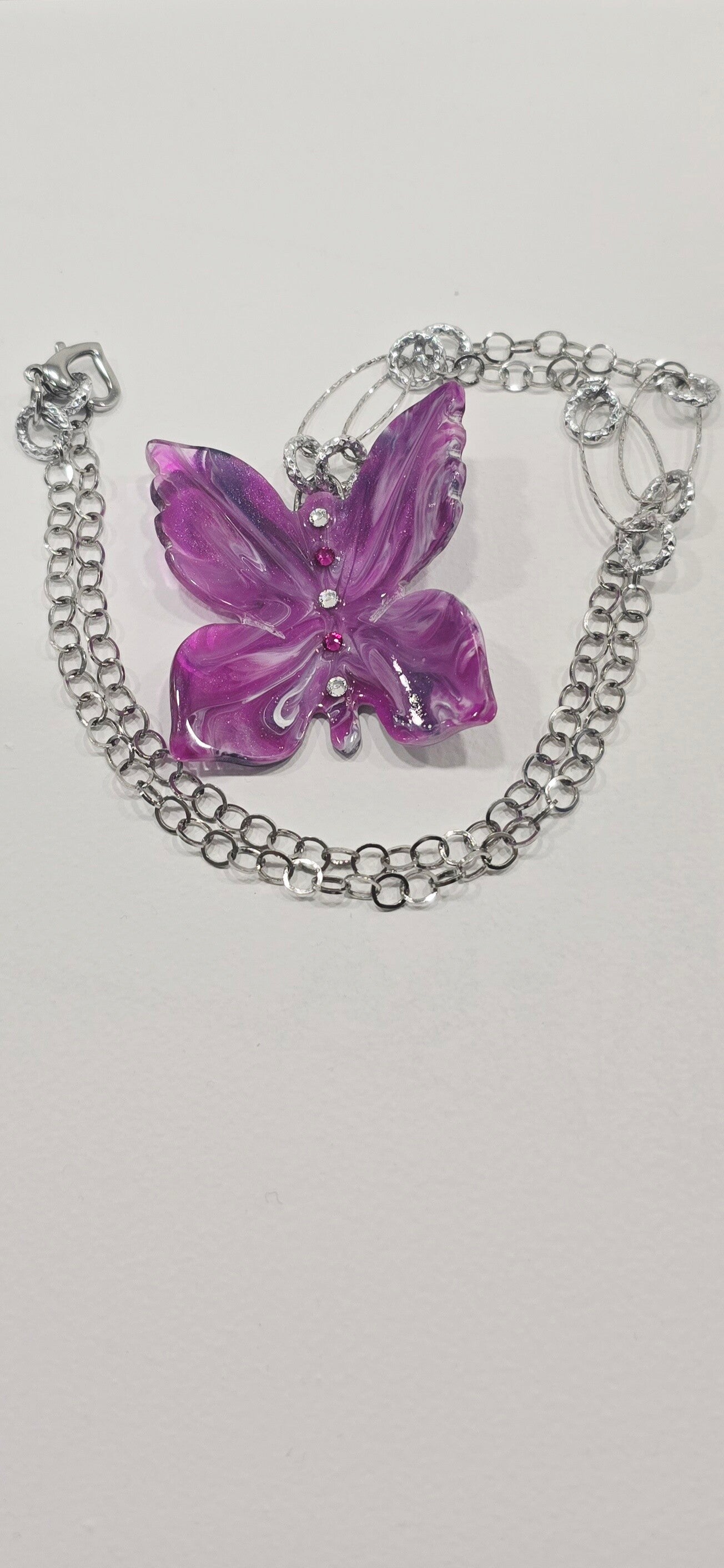 Appartenente alla Collezione CBQ, da catalogo, Collana con ciondolo a farfalla in resina fucsia, viola, bianco, nero, con applicazioni Swarovski, bianco, fucsia. Catena in acciaio inossidabile, con elementi Ag925 e chiusura a cuore in acciaio inossidabile. (ciondolo 4,5x4,8cm; lunghezza catena 55cm). #10/22